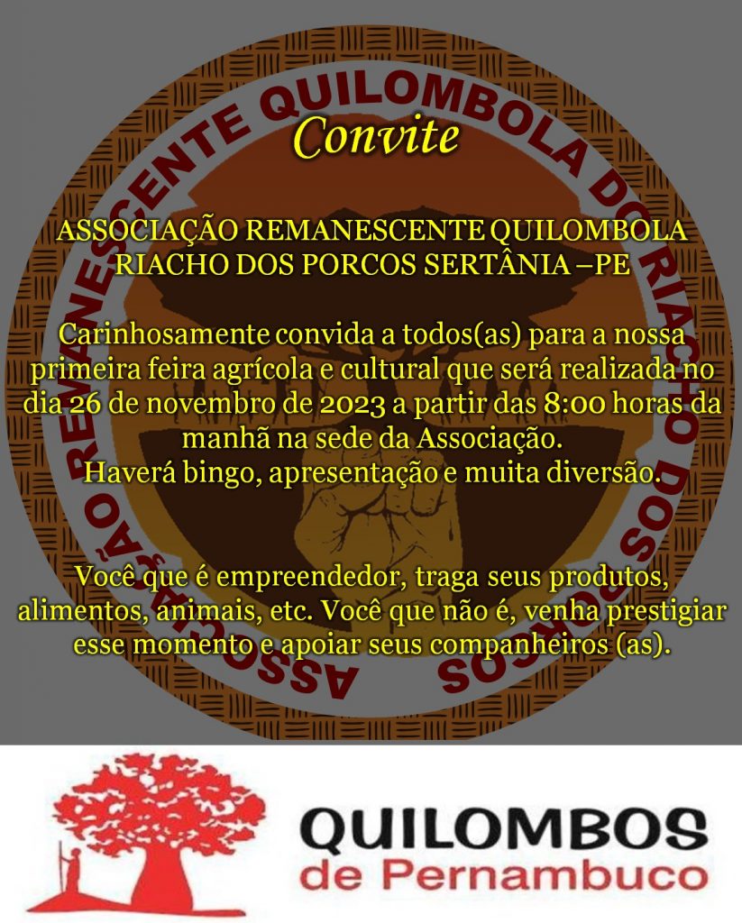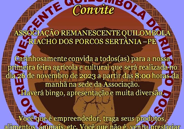 A associaçao Remanescente Quilombola Riacho dos Porcos/Sertânia, realiza neste domingo, dia 26, a 1ª Feira Agrícola e Cultural.