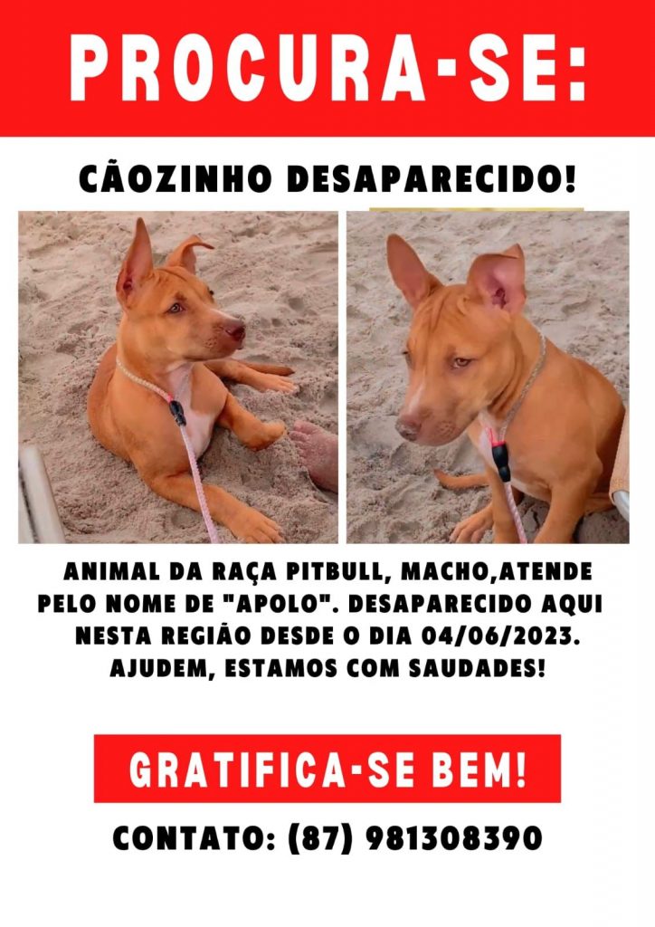 Desde o último domingo, dia 4, que o cachorro da raça Pitbull, e que atende pelo nome de Apolo, está desaparecido  e sua proprietária está em busca de informações.