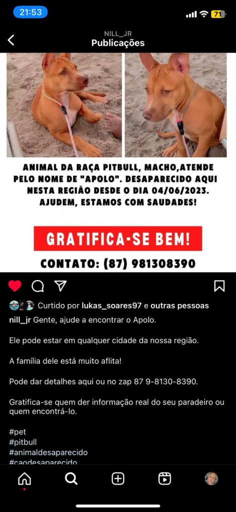 Quem tiver qualquer informação ligue para Andreia pelo número (87) 9 87 8855-2069 ou 9.81308390, que será bem gratificado.