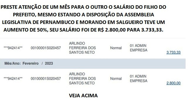 O FILHO, QUE RECEBEU 50% DE AUMENTO, MESMO ESTANDO A DISPOSIÇÃO DA ALEPE, ESTÁ MORANDO EM SALGUEIRO E ATÉ O MOMENTO NÃO SE SABE O QUE ELE FAZ NAQUELE ÓRGÃO. LEMBRANDO QUE ELE OCUPA O ÚNICO CARGO NA PREFEITURA E SEU PAI, O PREFEITO ÂNGELO FERREIRA, O COLOCOU A DISPOSIÇÃO DA ASSEMBLEIA LEGISLATIVA;