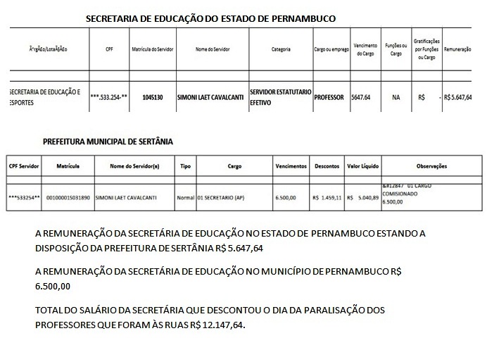 A IMAGEM ACIMA MOSTRA O SALÁRIO DA EX-PREFEITA CLEIDE FERREIRA, QUE MESMO MORANDO EM SERTÂNIA, “TRABALHAVA” COMO SECRETÁRIA PARLAMENTAR NO GABINETE DO DEP. GONZAGA PATRIOTA EM BRASÍLIA