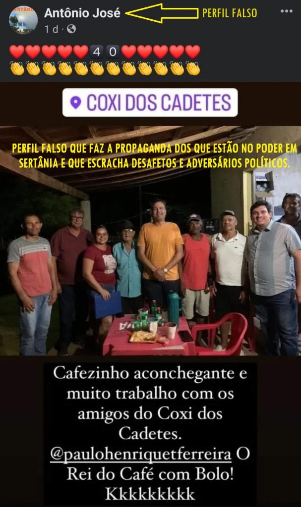 Pelo que aparenta até o próprio candidato a candidato, sobrinho do prefeito, foi pego de surpresa com esse anúncio, pois até o perfil falso que ele costuma “acompanhar” no facebook e está sempre fazendo propagandas suas e do gestor municipal, ainda ontem, dia 31, estava fazendo a sua “política” postando fotos e mostrando-o, ainda, como o melhor nome para a sucessão do tio. Perfil falso que todos sabem a quem pertence, né Sertania?