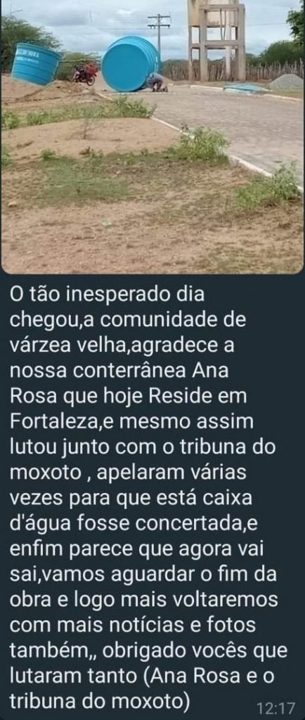“Quero agradecer primeiramente ao Tribuna do Moxotó e depois a senhora Ana Rosa, pela coragem de ter usado suas redes sociais para pedir e até implorar para que a prefeitura de Sertânia não só desativasse a caixa d’água prestes a cair, mas que resolvesse a questão do abastecimento de água naquela localidade. Hoje resolveram instalar duas caixas d’água e desativaram defitivamente aquela que estava prestes a cair. Que bom. Obrigado ao Tribuna do Moxotó, obrigado Ana Rosa”, disse a senhora Joselma, moradora de Várzea Velha em suas redes sociais.