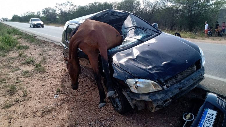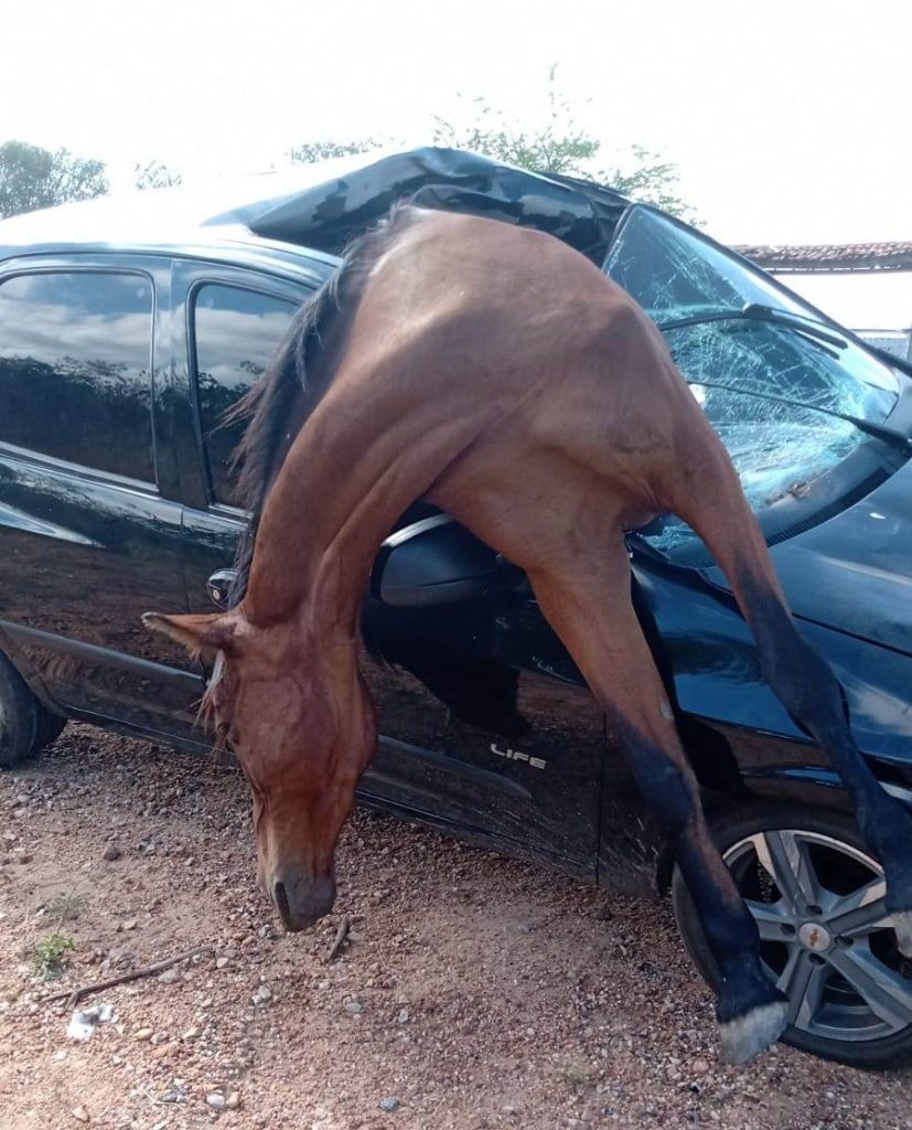 Observe que as imagens mostram que se houvesse alguém no lado do carona, a coisa seria muito séria, já que o animal, um cavalo, ficou praticamente dentro do veículo.