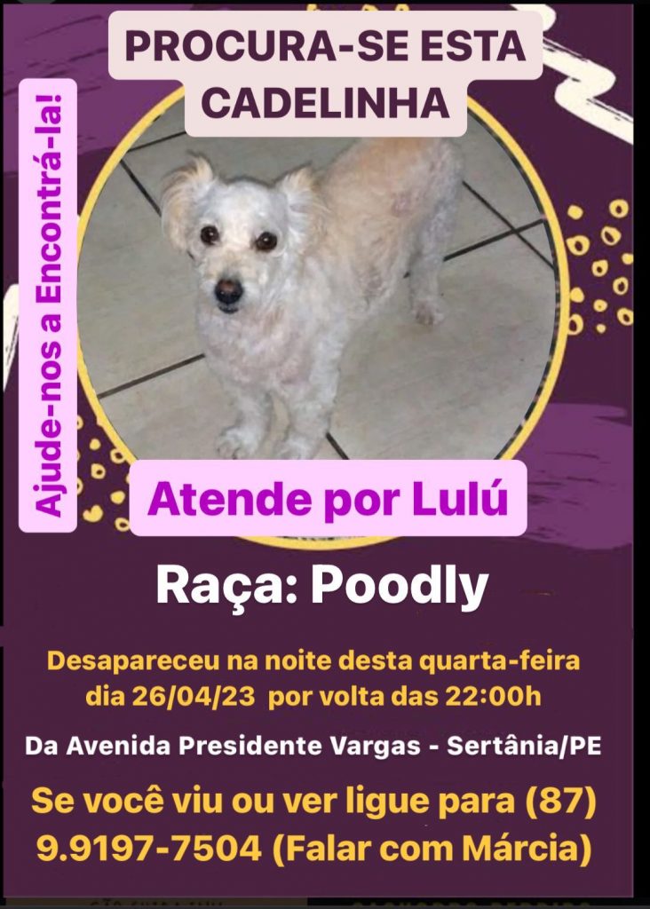 Quem souber alguma informação, entre em contato com seus donos pelo celular 87 9.9197.7504, falar com Márcia.