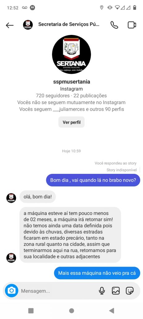NA REDE SOCIAL AO RESPONDER A UM DOS MORADORES DA LOCALIDADE É DESMENTIDO; “ESSA MAQUINA NÃO VEIO PARA CÁ”.
