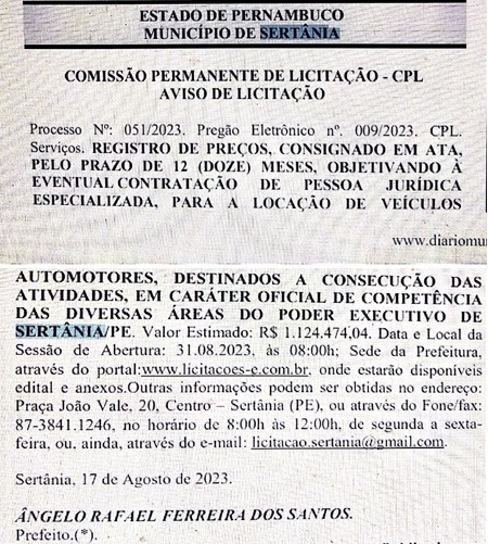 O que é mais estranho nisso é que enquanto o prefeito e sua equipe dizem que estao fazendo contenção de dispesa, há uma licitação feita no dia 17 de agosto para locação de carros para a municipalidade no valor de quase um MILHÃO E DUZENTOS. Veja logo abaixo a tal licitação. Com tantos carros que têm a prefeitura de Sertânia é de se estranhar que no momento em que corta gastos para saúde faz esse tipo de licitação.