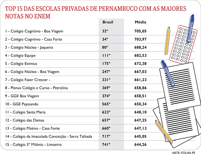A melhor escola privada de Pernambuco segundo os dados do Inep é o Colégio Cognitivo (Unidade Boa Viagem), no Recife, em 32º, com média de 705,05, e também com outra unidade (Casa Forte) do grupo ocupando a 34ª posição, com 703,97.