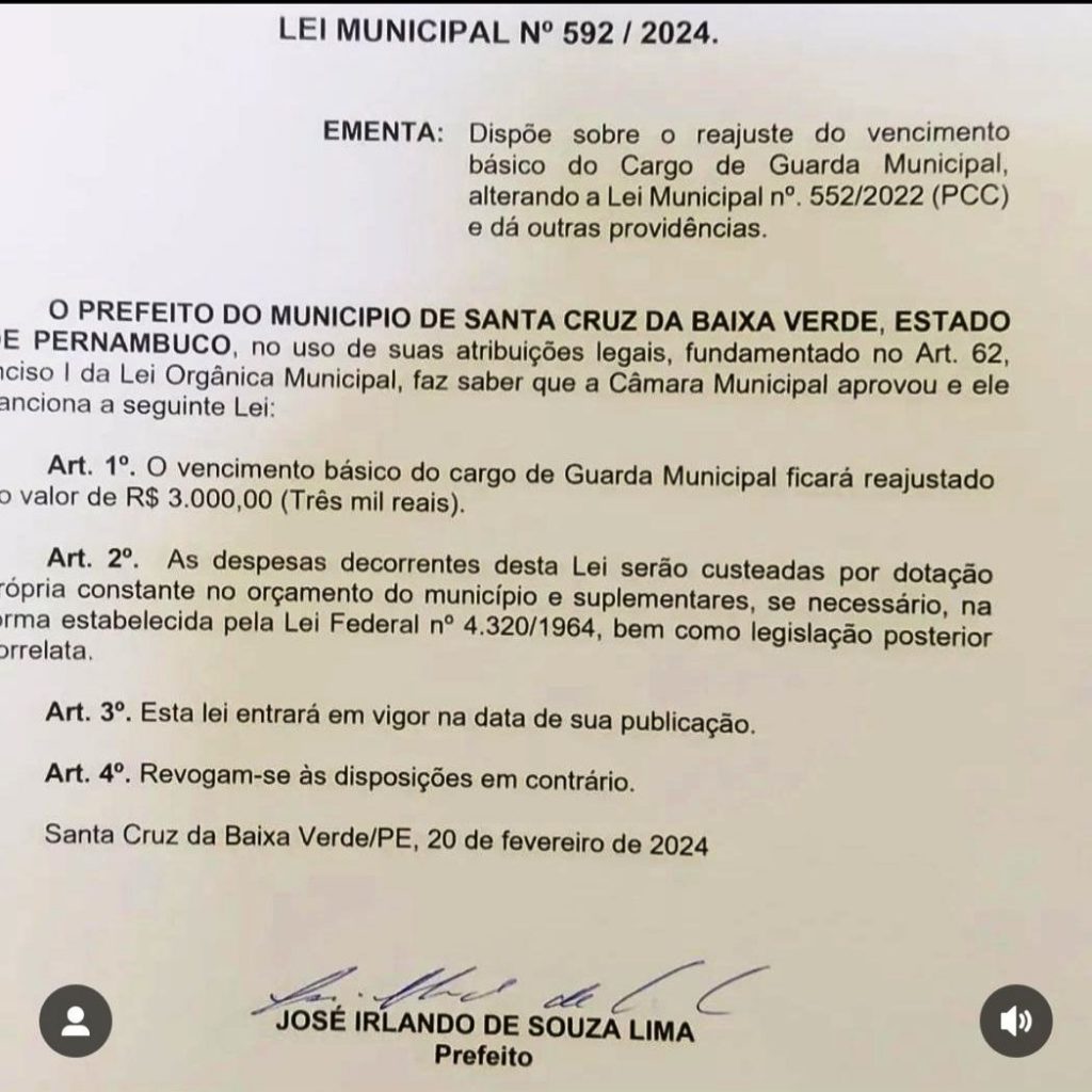 Veja acima o decreto da prefeitura de Santa Cruz da Baixa verde, reajustando o salário dos seus guerreiros municipais e ressaltando mais que o dinheiro para pagar os 3 mil reais a eles, é oriundo de recursos próprios se NECESSÁRIO NA FORMA ESTABELECIDA PELA LEI FEDERAL. Infelizmente em Sertânia, a preocupação parece ser com licitações milionárias para contratação de palco e artistas para shows e construções de praças, saúde, educação e segurança ficam sempre para depois. A ordem é gastar com futilidades.