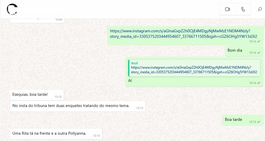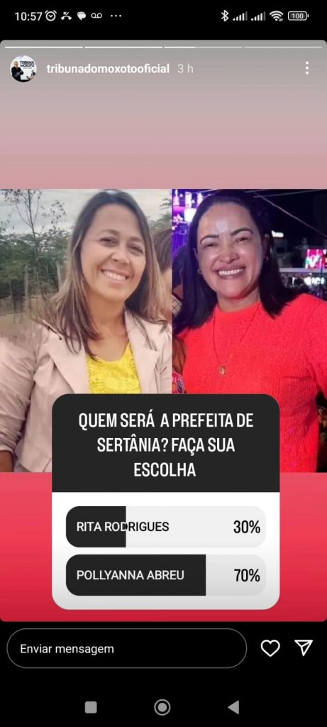 INTERNAUTAS FICARAM SEM ENTENDER E RELATARAM A REDAÇÃO DO TRIBUNA DO MOXOTÓ QUE ESTAVAM APARECENDO DUAS ENQUETES COM RESULTADOS DIFERENTE, UMA COM POLLYANNA NA FRENTE E UMA OUTRA COM RITA RODRGUES NA FRENTE, POR ISSO RESOLVEMOS TIRAR DO AR. NÓS DA PAGINA @TRIBUNADOMOXOTOOIFICIAL NO INSTAGRAM LAMENTAMOS O OCORRIDO, MAS TUDO ISSO FUGIU DO NOSSO CONTROLE, SENDO, PORTANTO, PROBLEMA DO PRÓPRIO SISTEMA.