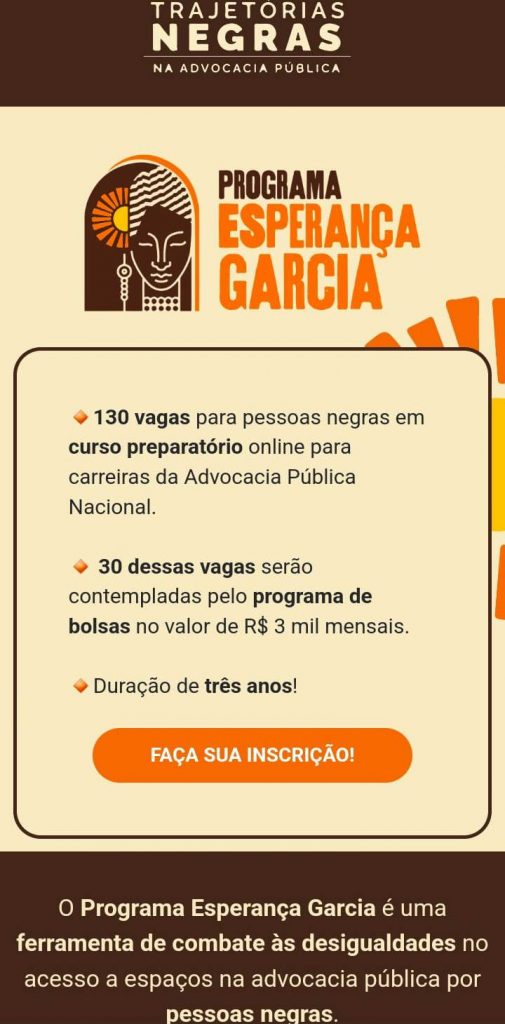 O Programa Esperança Garcia é gerido pelo Instituto de Referência Negra Peregum, com apoio do Ministério da Igualdade Racial e da Advocacia-Geral da União que oferece um curso preparatório virtual gratuito para as pessoas negras formadas ou graduanda em Direito, uma chance de se preparar para concursos na carreira da Advocacia Pública Nacional.