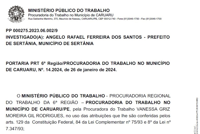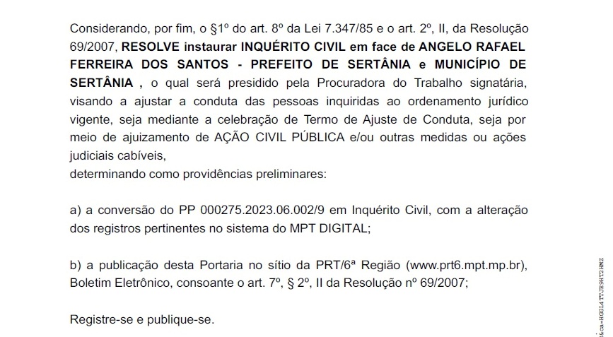 RESOLVE instaurar INQUÉRITO CIVIL em face de ANGELO RAFAEL FERREIRA DOS SANTOS – PREFEITO DE SERTÂNIA e MUNICÍPIO DE SERTÂNIA , o qual será presidido pela Procuradora do Trabalho signatária, visando a ajustar a conduta das pessoas inquiridas ao ordenamento jurídico vigente, seja mediante a celebração de Termo de Ajuste de Conduta, seja por meio de ajuizamento de AÇÃO CIVIL PÚBLICA e/ou outras medidas ou ações judiciais cabíveis.