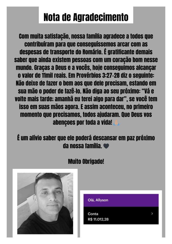 Os familiares de Romário, que morreu em acidente de moto na cidade de São Paulo e que estava fazendo uma campanha para que seu corpo fosse sepultado em Sertânia, mais precisamente em Albuquerque Né, emtiu uma nota de agradecimento a todos que contribuíram para que eles alcancessem a quantia desejada.