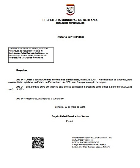 E o que é mais curioso é que a referida portaria de 3 de maio, assinada pelo próprio prefeito, coloca seu filho a disposição da ALEPE desde o dia 1º de janeiro, e foi ele mesmo que disse na rádio local que seu filho já estava a disposição daquele órgão desde 2021, então o quue se pergunta é: para que essa portaria de 3 de maio?? Tudo muito estranho não Sertânia?????