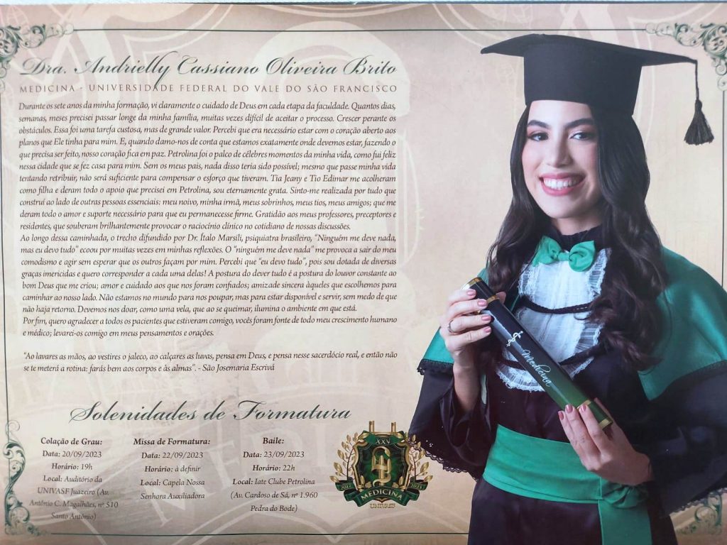 Foram sete anos de luta árdua até chega a este momento e a agora médica Dra. Andrielly em seu convite mostra toda sua felicidade e alegria por realizar este sonho, não só seu, mas dos seus pais.