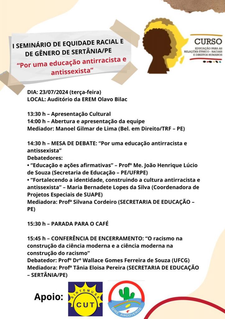 A volta às aulas na escolas estaduais em Sertânia foi marcada pela formação continuada com o tema “Identidades e diferenças, o debruçar sobre as relações étnico-raciais: educar para o (re) conhecimento e valorização da diversidade e da diferença, o seminário que foi norteado pelo mesmo tema e protagonizado por professores e estudantes do Curso de extensão sobre o mesmo tema da Universidade Federal de Campina Grande, extensão Campus de Sumé com a palestra da professora Maria Bernadete Lopes, coordenadora de projetos especiais de SUAPE.