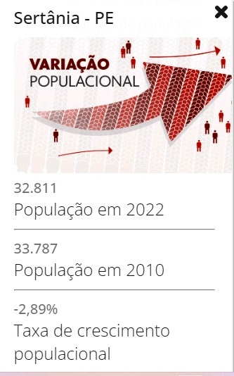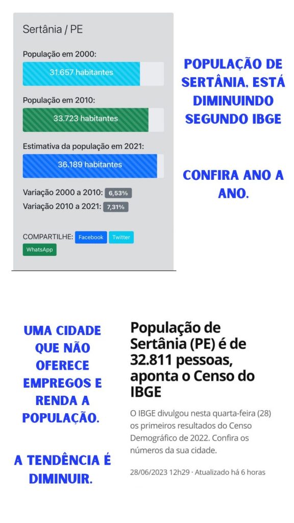 Esta é a Sertânia que decresce, que tinha a estimativa da população em 2021 de 36.189 habilitantes e aparece com apenas 32.811 pessoas. Obviamente que vários fatores para serem estudados para tamanha discrepância nesses números, mas é obvio tambpem que nossa população está diminuinda sim, retrai ante a falta de oportunidades cada vez mais, talvez tambem seja um reflexo da péssima saúde, da educação horrivel, com professores sendo tratados a ferro e fogo e da má qualidade em outros serviços que oferecem aos seus municípes.