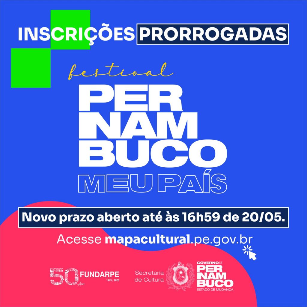 As inscrições para o edital do Festival Pernambuco Meu País, promovido pelo Governo de Pernambuco, através da Secretaria de Cultura do Estado e da Fundação do Patrimônio Histórico de Pernambuco (Fundarpe), serão prorrogadas para a próxima segunda-feira, 20 de maio. A iniciativa levará, de forma itinerante, uma programação que abrange todas as linguagens artísticas para sete cidades do Agreste e Sertão, com o objetivo de promover a classe artística e fortalecer a economia e o turismo no Estado. O edital para apresentação de propostas artísticas de todo o Brasil, de forma democrática e inclusiva, está disponível aqui.