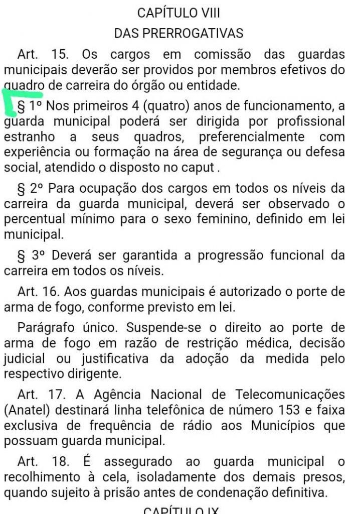 É que na ânsia de beneficiar os seus, o prefeito Ângelo Ferreira, descumpriu a lei que cria a Guarda Municipal, no seu capitulo VIII (DAS PRERROGATIVAS), artigo 15, onde diz que os cargos em comissão das guardas municipais deverão ser providos por membros efetivos do quadro de carreira do órgão ou entidade, completando com o que diz o parágrafo 1º, que deixa mais claro ainda, rezando que após quatro anos de funcionamento, a guarda municipal poderá ser dirigida por profissional estranho a seus quadros, preferencialmente com experiência ou formação na área de segurança ou defesa social, atendido o disposto no caput.