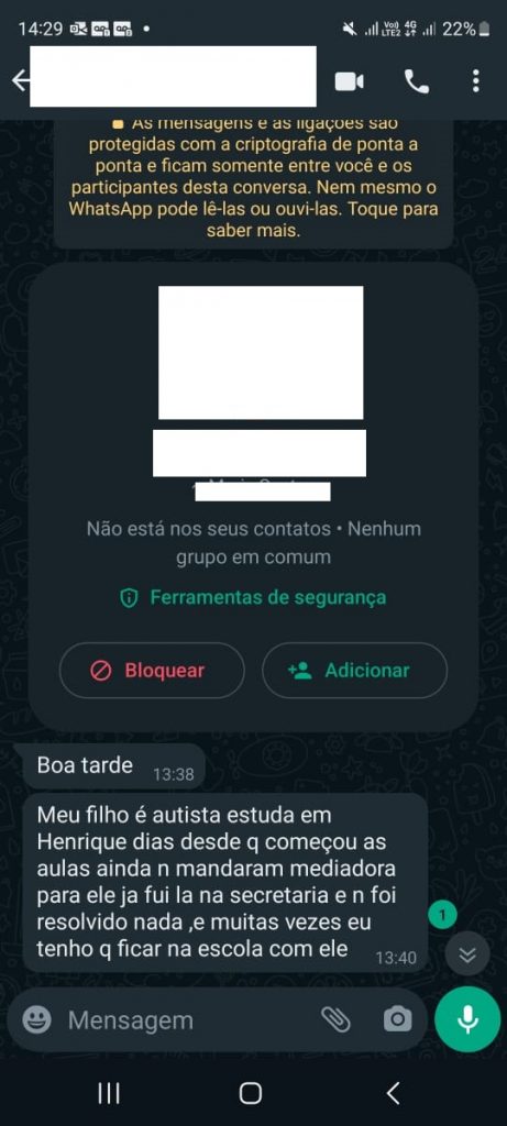 “Já não sei mais o que fazer, meu filho de 6 anos, desde o inicio do ano está sem acompanhamento de um mediador(a), as vezes eu fico com ele na sala. É muito descaso com a educação dele. Eu sou mãe,amo meu filho, mas não tenho treinamento suficiente para acompanha-lo da forma devida. Peço a secretaria de educação que veja isso por favor”, disse a mãe visivelmente emocionada e preocupada com a situação do seu filho.