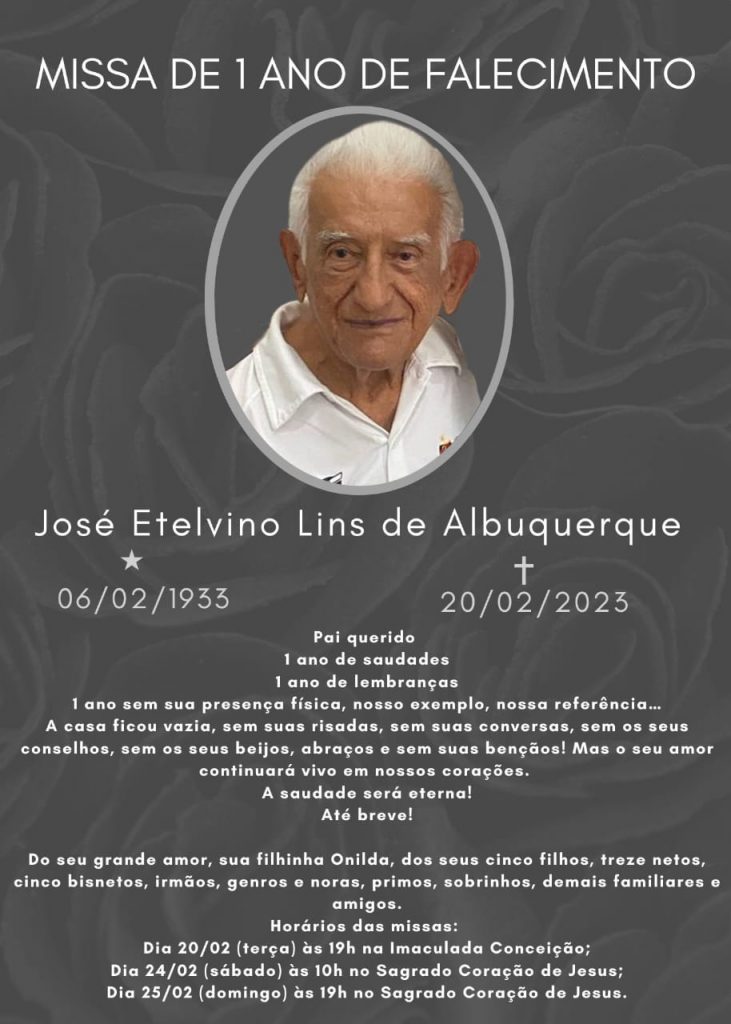 Nesta terça-feira, dia 20, os familiares de José Etelvino Lins de Albuquerque, sua esposa Onilda Maciel, seus cinco filhos, seus 13 netos, cinco bisnetos, irmãos, genros, nora, primos, sobrinhos, demais familiares e amigos, convidam toda comunidade cristã para a missa de primeiro aniversário do falecimento do inesquecivel José Etelvino Lins de Albuquerque.