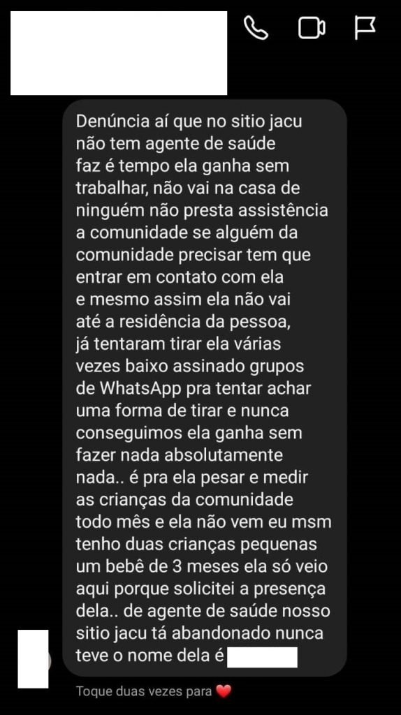 DEPOIS DO SÍTIO BREJO VELHO, AGORA É A VEZ DA COMUNIDADE DO SITIO JACU TAMBÉM RECLAMAR DA FALTA DA AGENTE DE SAÚDE.