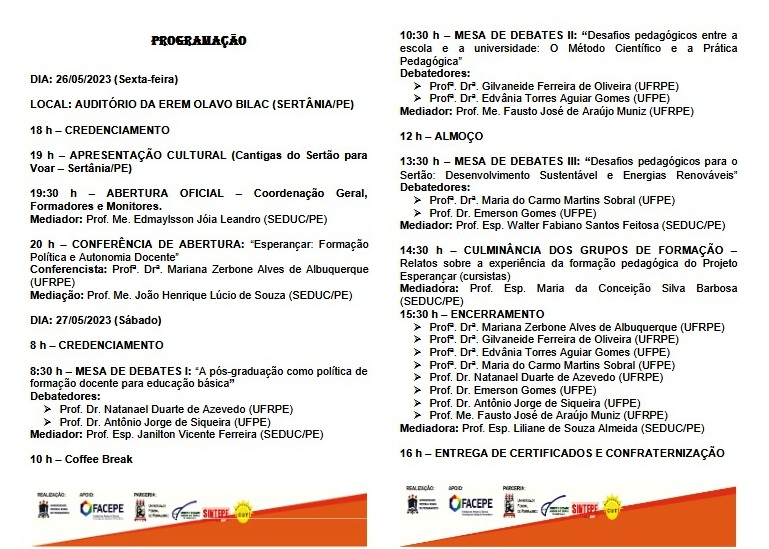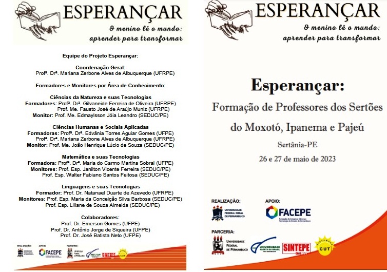 Foi o projeto ESPERANÇAR: Formação de Professores dos Sertões do Moxotó, Ipanema e Pajeú, e ocorreu entre dos dias 26 e 27 de maio de 2023, contando com a participação de professores de todas essas regiões citadas acima e com 8 professores das Universidades Federal de Pernambuco e Universidade Federal Rural de Pernambuco.