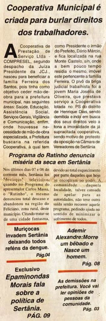 Obras inacabadas e abandonadas; favorecimento familiar e de amigos pela atual gestão em Sertânia, descaso com a saúde das pessoas, licitações milionárias sem muitas explicações, são algumas das mazelas da atual gestão que ainda quer continuar comandando o município, talvez apresentando um candidato tirando de sua cartola mágica, um candidato inexpressivo e montado no histórico de uma administração com esse perfil e achando que elegerá um poste, pois confia no “prestigio” do líder do grupo que comanda esse mesmo grupo com mão de ferro e de forma implacável, não dando o direito a ousadia do pensar. Vamos ver no que dar, as eleições estarão ai. Que venha 2024!!