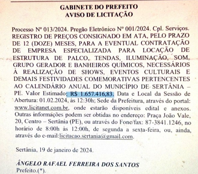 O processo de licitação 001/2024, terá sua sessão aberta no dia 02 de fevereiro, no prédio da prefeitura de Sertânia e terá o valor exata de um milhão seiscentos e cinquenta e sete mil, quatrocentos e dezesseis reais e oitenta e três centavos (R$ 1.657.416,83), portanto, quase dois milhões.