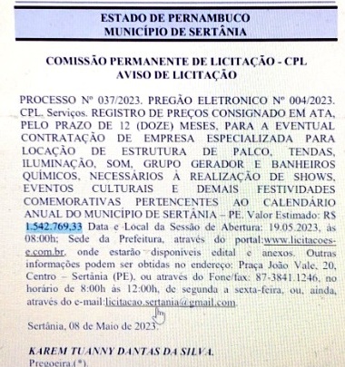 Mesmo tendo uma saúde precária para os sertanienses, onde falta até remédio dos mais básicos; mesmo tendo uma educação ainda abaixo do IDEB desde 2016; mesmo com tantas denúncias de ruas escuras, matos e lixos tomando conta de ruas, repartições públicas municipais e zona rural sofrendo com o abandono; mesmo muitos sertanienses saindo de sua terra para realizar exames em Afogados da Ingazeira e em outras cidades, mesmo assim, eis que a prefeitura, para legitimar a sua política de pão e circo, está contratando uma empresa (tomara que seja outra, porque parece que apenas uma ganha, a de Romário Som, da cidade de Custódia. Vamos ver se vai ser ela que vai ganhar de novo), no valor de quase dois milhões, para ser mais exato o total é de R$ 1.542,769,33 (hum milhão quinhentos e quarenta e dois mil setecentos e sessenta e nove reais e trinta e três centavos).