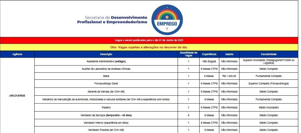 Neste dia 7 de junho várias vagas de empregos para a cidade de Arcoverde. Veja o quadro abaixo: