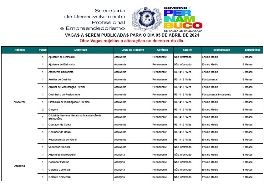 Nestge dia 5, o quadro de oportunidade de emprego vem com diversass vagas em várias áreas em Arcoverde e toda região do Estado de Pernambuco.