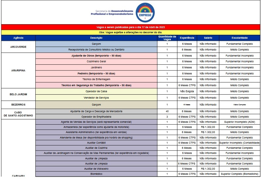 A partir de hoje vamos sempre divulgar o quadro de vagas na região de Arcoverde e em todo Estado. Basta clicar no arquivo abaixo e ver qual sua área.