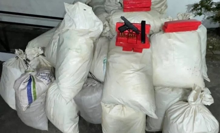 Ele foi detido e, ao fazer uma varredura na área, foram encontrados 988 quilos de maconha em sacos, além de uma pistola calibre 380, um carregador e 21 munições do mesmo calibre.