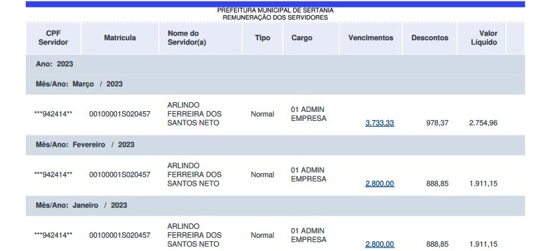 VEJA OS VENCIMENTOS DO FILHO DO PREFEITO ÂNGELO FERREIRA, OBSERVE QUE ELE, MAIS TAMBÉM A SUA TIA, IRMÃ DO PREFEITO, CLÁUDIA FERREIRA, QUE RECEBE ATÉ INSALUBRIDADE SENDO CHEFE DA CASA DE APOIO EM RECIFE, DE UM MÊS PARA OUTRO RECEBERAM AUMENTO DE 50% EM SEUS SALÁRIOS. PENSE NUM NEGÓCIO BOM SER AMIGO OU PARENTE DO “REI”. ENQUANTO ISSO OS PROFESSORES PENAM PRA CONSEGUIR MÍSEROS 14%.
