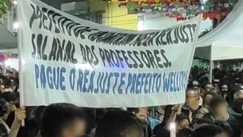 No último sábado, 03 de junho, aconteceu a abertura da tradicional festa de rua do padroeiro Santo Antônio, na cidade de Ibimirim-PE. Estiveram presentes, o prefeito do município, José Welliton de Melo Siqueira e comitiva, e o Deputado Federal, Carlos Veras do PT. Ambos discursaram antes da atração principal começar. Em meio a fala do prefeito, foi erguida uma faixa no meio da multidão com os seguintes dizeres: PREFEITO DE IBIMIRIM NEGA O REAJUSTE SALARIAL AOS PROFESSORES. PAGUE O REAJUSTE, PREFEITO WELLITON!