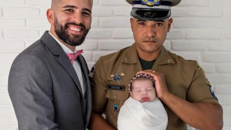 A frase é do sargento da Polícia Militar Valdi Barbosa, que junto com o marido, Rafael Moreira, conseguiu na Justiça o direito de tirar seis meses de licença-paternidade após o nascimento da filha Sofia, fruto de uma fertilização in vitro com barriga solidária. De acordo com a PM, esse foi o primeiro caso desse tipo na corporação.