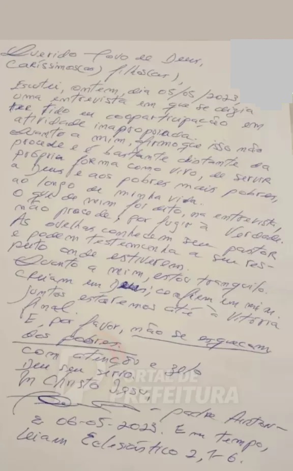 “Querido povo de Deus, caríssimo(a) filhos )as), escutei, ontem, dia 5 de maio de 2023, uma entrevista em que se dizia ter tido uma cooparticipação em atividade inapropriada. Diante a mim, afirmo que isso não procede e é bastante distante da própria forma como vivo, de servir a Deus e aos pobres mais pobres, ao longoo da minha vida. O que de mim foi dito, na entrevista, as ovelhas conhecem seu pastor e podem testemunhar a seu respeito ond estiverem. Quanto a mim, estou tranquilo. Creiam em Deus, confiem em mim. juntos estaremos até a vitória final. E, por favor, não se esqueçam dos pobres. Com atenção e zelo deu seu servo. em Cristo Jesus. Padre Airton Freire.  En Tempo, leiam Eclesiástico 2,1 6.”