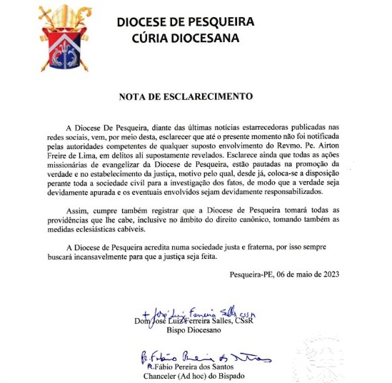 A Diocese de Pesqueira emitiu nota. Leia ao lado da matéria.