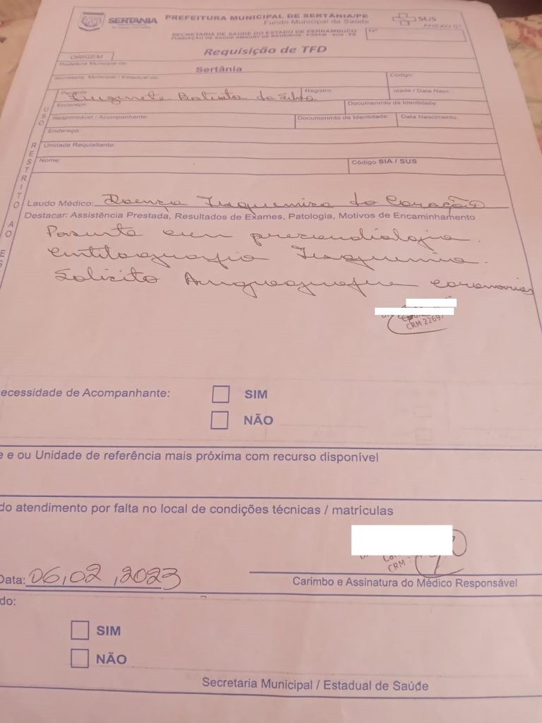Outro caso que nos chega é de uma outra idosa, a senhora Luzinete Batista da Silva, de 68 anos de idade, residente na rua José Patu de Goiás, nº 17, em Henriques Dias, que há quase 4 meses espera um cateterismo e não consegue e ela ainda diz na sua denúncia que perdeu um irmão por este mesmo motivo.