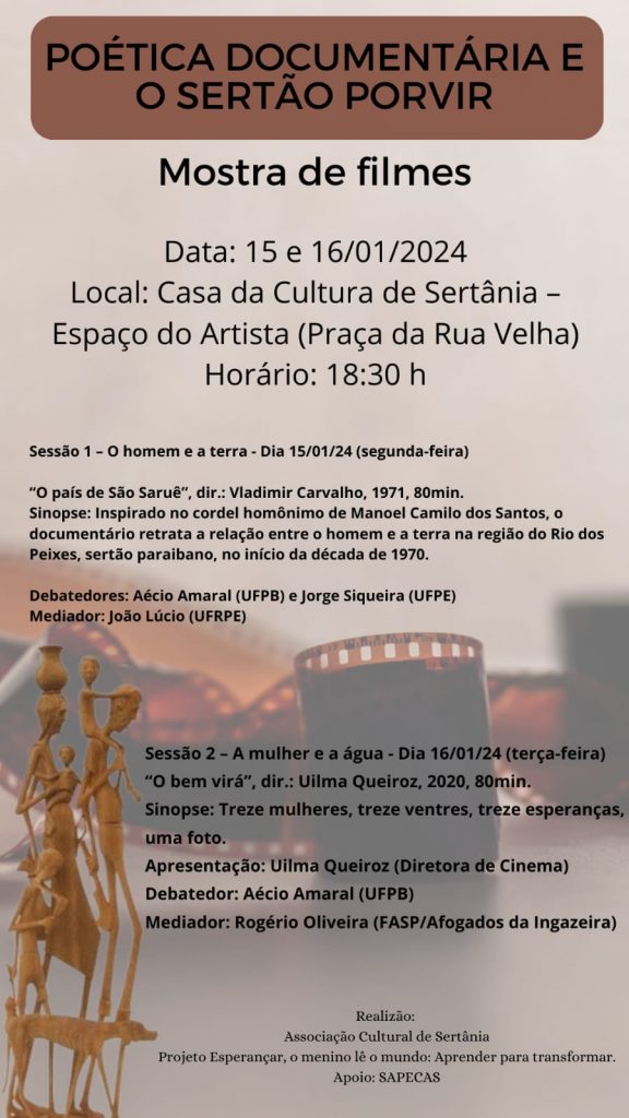 A Associação Cultural de Sertânia (ACORDES) em parceria com o “Projeto Esperançar, o menino lê o mundo: aprender para transformar” e apoio da SAPECAS promove uma mostra de filmes com o tema “Poética Documentária e o Sertão Porvir”, nos próximos dias 15 e 16/01/24 na Casa da Cultura de Sertânia (Espaço do Artista), localizada na Praça da Rua Velha, a partir das 18:30 h.