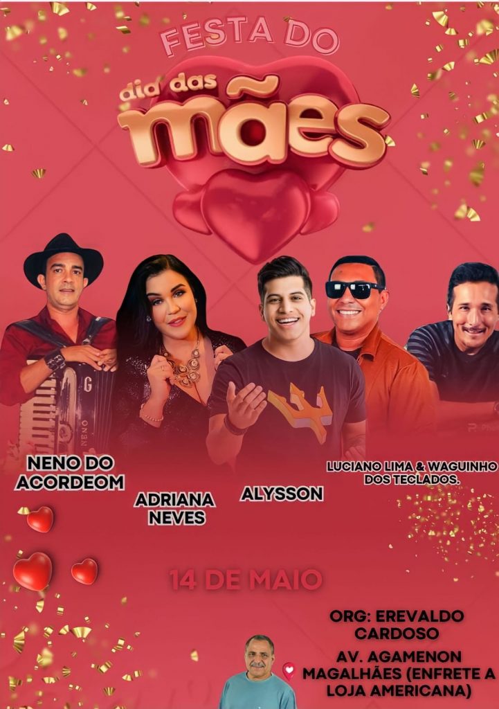 Marque sua presença e garante um brinde ou para você que é mãe ou ganhe um presente e leve para sua mãe. A festa é uma realização de Everaldo Cardoso com apoio do comércio local.